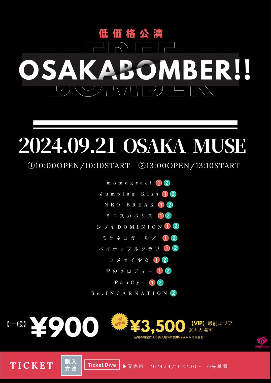 ■出演: すべての瞬間は君だった。 momograci Jumping Kiss NEO BREAK ミニスカポリス シブヤDOMINION ミケネコガールズ パイナップルクラブ ユメオイ少女 青のメロディー FanCy- Re:INCARNATION ※出演部は画像をご確認下さい ■料金:1Drink別途 [観覧] ①VIP(Sチケット)[最前エリア]※一部撮影可(下記参照) 前売3,500円 ②一般チケット 前売900円 ※①撮影可出演者 静止画〇/動画○・・momograci/Jumping Kiss 静止画〇/動画×・・ミニスカポリス/シブヤDOMINION/ユメオイ少女/FanCy-/青のメロディー/Re:INCARNATION 上記以外出演者は現時点では撮影不可です。撮影可となった場合は当ページにて知いたします。 ・動画撮影はスマホ限定となります。 ・三脚一脚使用不可。 ・脚立踏み台使用不可。 [配信]なし ※ライブのご観覧の他、特典会に御参加頂けます※整理番号順入場 ※出演者の変更・キャンセルに伴う主催者からの返金払い戻しはございません。 【プレイガイド】 https://t-dv.com/240921muse ※9/11(水)22:00~ ≪入場順≫最優先入場チケット→一般チケット ※整理番号順 *お客様の体調不良を含めた御都合等によるチケットのキャンセル・払い戻し等はお受けできませんのでご了承下さい。 以下サイトにて最新情報随時発表 https://www.monstarjapan.jp/#idolidge https://twitter.com/IDOLidge