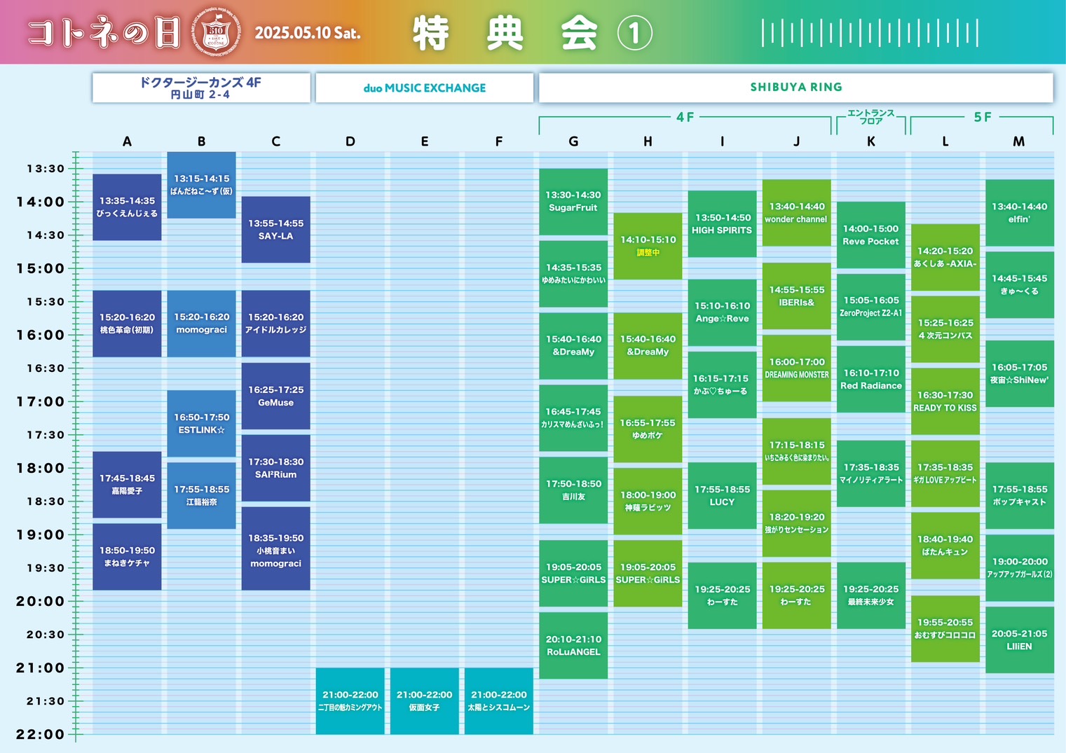 太陽とシスコムーン/吉川友/嘉陽愛子/最終未来少女/Sweet Alley/DREAMING MONSTER/HIGH SPIRITS/カリスマめんざいふっ!/マイノリティアラート/4次元コンパス/SAI²Rium/SAY-LA/READY TO KISS/スプスラッシュ/ギガLOVEアップビート/おむすびコロコロ/いちごみるく色に染まりたい。/昼夜逆転/EYE CANDY/MORE*/ばたんキュン/HALO PALLETE/TheWORLD/東京CuteCute/Red Radiance/ポップキャスト/ゆめみたいにかわいい/みらくる★ふぉーぜ/上月せれな/亜利美里