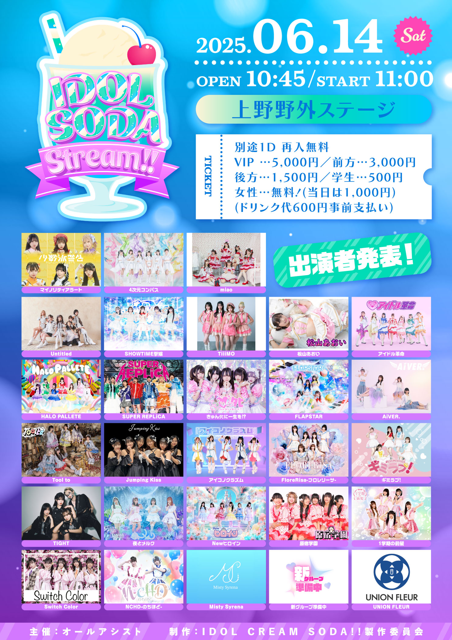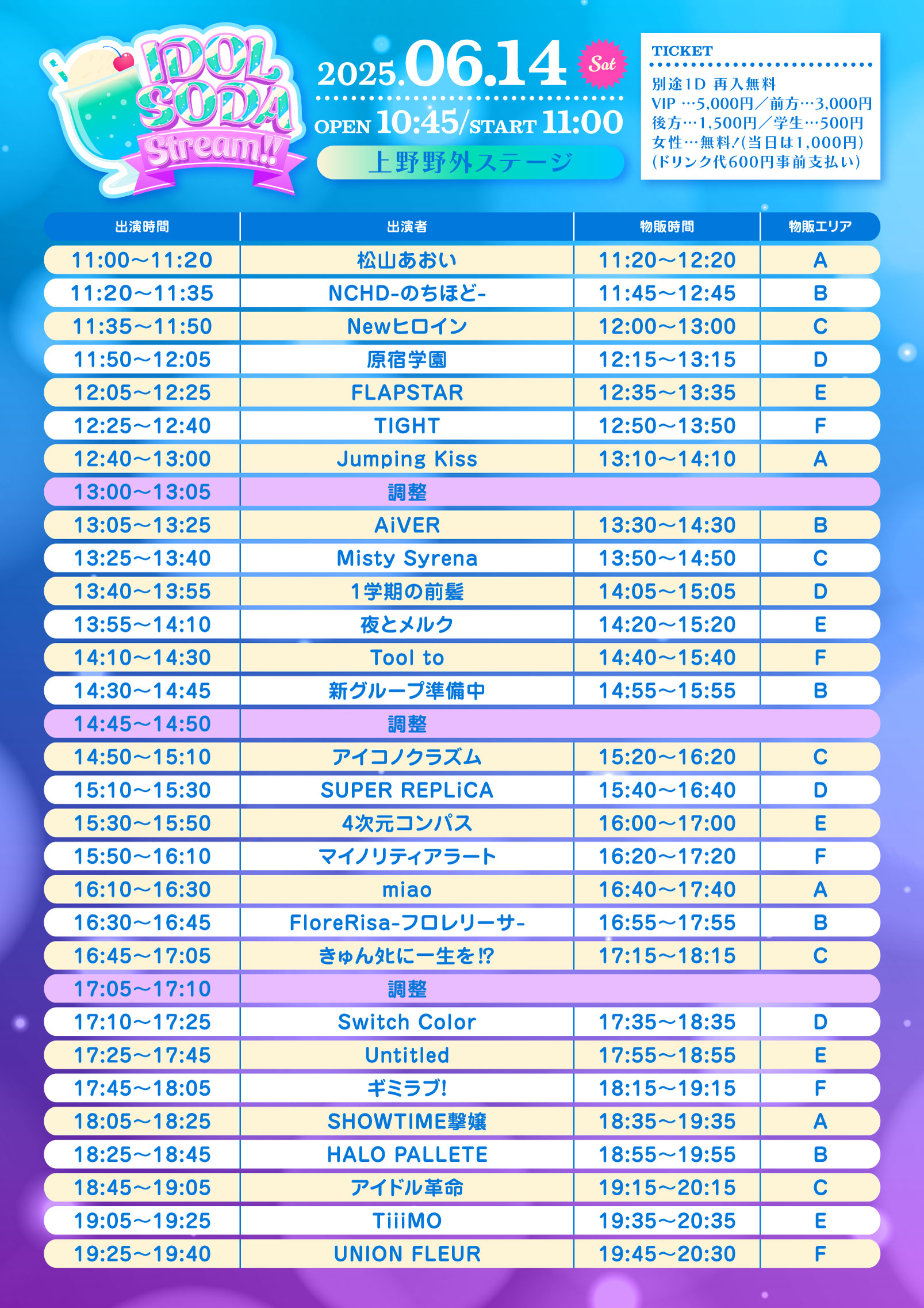 1,VIP席5,000円(別途1d600円) 当日+500円:先着購入順入場 最前観覧も可能