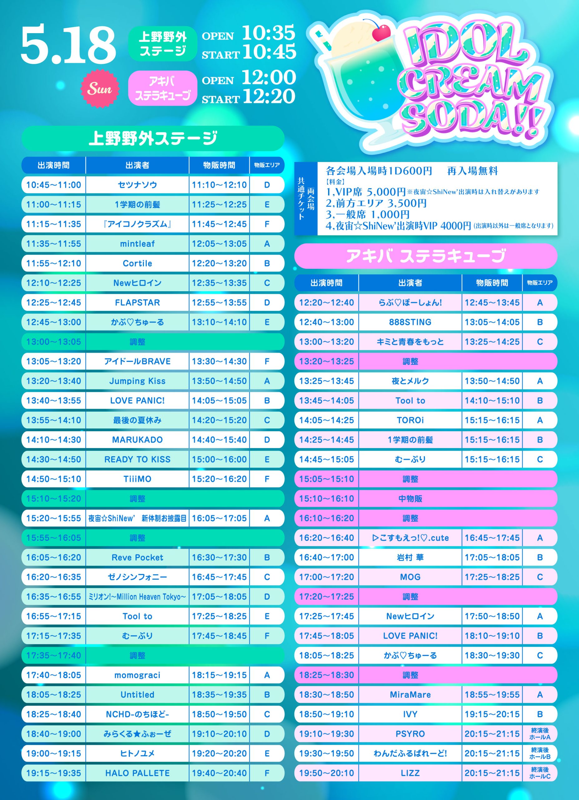 夜宙☆ShiNew’/momograci/Ready to kiss/ミリオン!~Million Heaven Tokyo~/Untitled/MARUKADO/FLAPSTAR/TiiiMO/むーぷり/かぷ♡ちゅーる/みらくる★ふぉーぜ/Jumping Kiss/mintleaf/最後の夏休み/『アイコノクラズム』/Tool to/ゼノシンフォニー/Newヒロイン/アイドールBRAVE/Reve Pocket/Cortile/NCHD-のちほど-/セツナソウ/LOVE PANIC!/