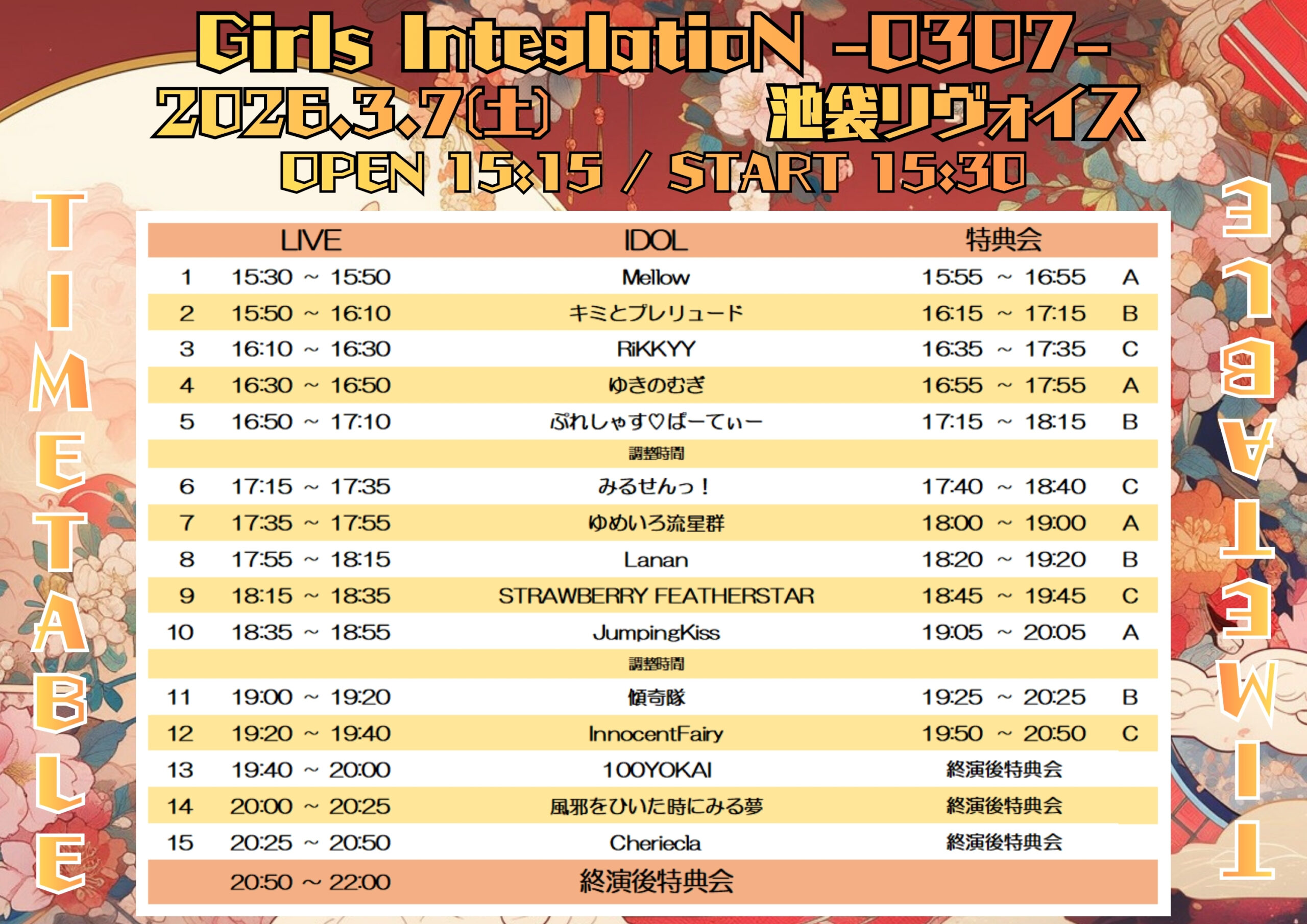 【出演】InnocentFairy / 風邪をひいた時にみる夢 / キミとプレリュード / Cheriecla / JumpingKiss / STRAWBERRY FEATHERSTAR / 100YOKAI / ぷれしゃす♡ぱーてぃー / みるせんっ! / Mellow / ゆきのむぎ / ゆめいろ流星群(福島県) / Lanan / RiKKYY
