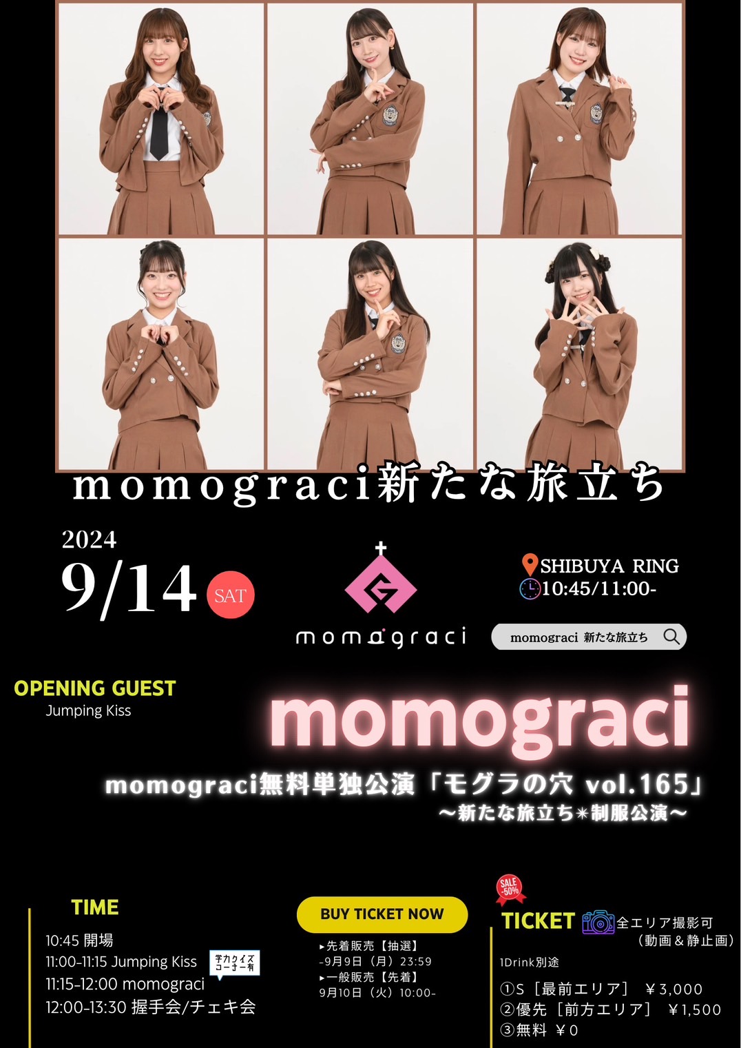 momograci 無料単独公演「モグラの穴 vol.165〜新たな旅立ち✴︎制服公演〜」 ■日時:9月14日(土)10:45開場/11:00開演 ■会場:SHIBUYA RING ■出演:momograci ■Opening Guest:Jumping Kiss ■料金:1Drink別途 ※全エリア撮影可能(動画&静止画) [観覧] ①Sチケット[最前エリア] 前売3,000円 ※スーパーファストパス付 ②優先エリアチケット 前売1,500円 ※スーパーファストパス付 ③無料チケット 0円 ※ドリンク代要事前決済 ーーーーーーーーーーーーーーーー ※スーパーファストパス⇒momograciの特典会の優先撮影権(チェキ券は別途お買い求めください) [配信]momograci YouTubeチャンネルにて無料配信予定 https://www.youtube.com/@momograci ※ライブのご観覧の他、終演後の特典会に御参加頂けます ※整理番号順入場 ※撮影は 動画:スマホ限定 静止画:一眼・スマホ可とさせて頂きます ※撮影は、客席サイド以外のお客様は、頭より上に構えての撮影は後ろのお客様や配信カメラに被るおそれがございますのでご遠慮ください ※動画撮影に関して、三脚等に固定して無人で撮影する行為は禁止とさせて頂きます ※出演者の変更・キャンセルに伴う主催者からの返金払い戻しはございません。 【プレイガイド】 TIGET https://t-dv.com/240914momo [発売日] 先行(抽選) -2024年9月9日(月)23:59 一般(先着順) 2024年9月10日(火)10:00- ≪入場順≫ 最優先入場チケット(整理番号順)→優先入場チケット(整理番号順)→一般チケット(整理番号順) *お客様の体調不良を含めた御都合等によるチケットのキャンセル・払い戻し等はお受けできませんのでご了承下さい。 *当日体調がすぐれない場合はご参加をお見送り頂きます様お願い申し上げます。 以下サイトにて最新情報随時発表 https://www.monstarjapan.jp/#idolidge https://twitter.com/IDOLidge