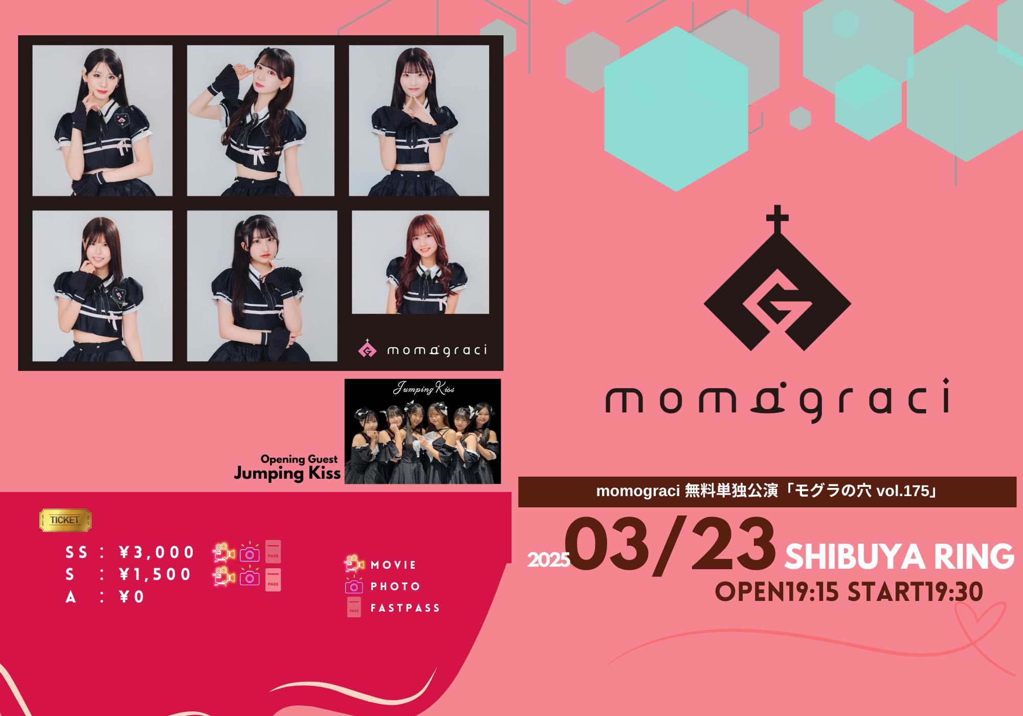 momograci 無料単独公演「モグラの穴 vol.175」 ■日時:3月23日(日)19:15開場/19:30開演 ■会場:渋谷RING ■出演:momograci ■オープニングゲスト:Jumping Kiss ■料金:1Drink別途 [観覧] ①Sチケット[最前エリア] 前売3,000円 ※撮影可能(動画&静止画) ※スーパーファストパス付 ②優先エリアチケット 前売1,500円 ※撮影可能(動画&静止画) ※スーパーファストパス付 ③無料チケット 0円 ーーーーーーーーーーーーーーーー ※スーパーファストパス⇒momograciの特典会の優先撮影権(チェキ券は別途お買い求めください) [配信]momograci YouTubeチャンネルにて生配信予定 https://www.youtube.com/@momograci ※ライブのご観覧の他、終演後の特典会に御参加頂けます ※整理番号順入場 ※撮影は 動画:スマホ限定 静止画:一眼・スマホ可とさせて頂きます ※撮影は、客席サイド以外のお客様は、頭より上に構えての撮影は後ろのお客様や配信カメラに被るおそれがございますのでご遠慮ください ※三脚・一脚・脚立・踏み台の使用を可能とさせて頂きます ※出演者の変更・キャンセルに伴う主催者からの返金払い戻しはございません。 【プレイガイド】 https://t-dv.com/250323momo [発売日] 先行(抽選) -2025年3月18日(火)23:59 一般(先着順) 2025年3月19日(水)10:00- ≪入場順≫ 最優先入場チケット(整理番号順)→優先入場チケット(整理番号順)→一般チケット(整理番号順) *お客様の体調不良を含めた御都合等によるチケットのキャンセル・払い戻し等はお受けできませんのでご了承下さい。 *当日体調がすぐれない場合はご参加をお見送り頂きます様お願い申し上げます。 以下サイトにて最新情報随時発表 https://www.monstarjapan.jp/#idolidge https://twitter.com/IDOLidge