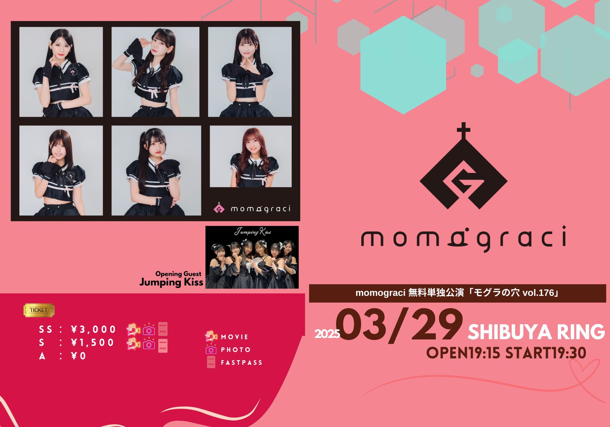 momograci 無料単独公演「モグラの穴 vol.176」 ■日時:3月29日(土)19:15開場/19:30開演 ■会場:渋谷RING ■出演:momograci ■オープニングゲスト:Jumping Kiss ■料金:1Drink別途 [観覧] ①Sチケット[最前エリア] 前売3,000円 ※撮影可能(動画&静止画) ※スーパーファストパス付 ②優先エリアチケット 前売1,500円 ※撮影可能(動画&静止画) ※スーパーファストパス付 ③無料チケット 0円 ーーーーーーーーーーーーーーーー ※スーパーファストパス⇒momograciの特典会の優先撮影権(チェキ券は別途お買い求めください) [配信]momograci YouTubeチャンネルにて生配信予定 https://www.youtube.com/@momograci ※ライブのご観覧の他、終演後の特典会に御参加頂けます ※整理番号順入場 ※撮影は 動画:スマホ限定 静止画:一眼・スマホ可とさせて頂きます ※撮影は、客席サイド以外のお客様は、頭より上に構えての撮影は後ろのお客様や配信カメラに被るおそれがございますのでご遠慮ください ※三脚・一脚・脚立・踏み台の使用を可能とさせて頂きます ※出演者の変更・キャンセルに伴う主催者からの返金払い戻しはございません。 【プレイガイド】 https://t-dv.com/250329momo [発売日] 先行(抽選) -2025年3月18日(火)23:59 一般(先着順) 2025年3月19日(水)10:00- ≪入場順≫ 最優先入場チケット(整理番号順)→優先入場チケット(整理番号順)→一般チケット(整理番号順) *お客様の体調不良を含めた御都合等によるチケットのキャンセル・払い戻し等はお受けできませんのでご了承下さい。 *当日体調がすぐれない場合はご参加をお見送り頂きます様お願い申し上げます。 以下サイトにて最新情報随時発表 https://www.monstarjapan.jp/#idolidge https://twitter.com/IDOLidge