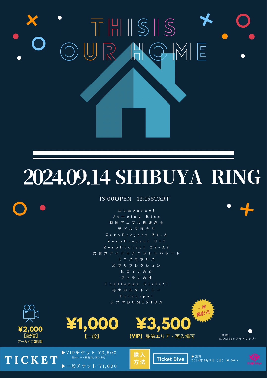 「THIS is OUR HOME」 ■日時:2024年9月14日(土)13:00開場/13:15開演 ■会場:SHIBUYA RING 🎤JumpingKiss 13:15~13:35(20分) ⏰特典会 13:40~14:40【4F A 】 ■出演: momograci Jumping Kiss 戦国アニマル極楽浄土 ヲドルマヨナカ ZeroProject Z4-A ZeroProject U17 ZeroProject Z2-A2 異世界アイドル☆パラレルパレード ミニスカポリス 幻奏リフレクション ヒロインの心 ヴィランの掟 Challenge Girls!! 再生のルクトゥミー Principal シブヤDOMINION ■チケット 1Drink別途 ①Sチケット(最前エリア) 3500円 ②一般チケット 1000円 [ライブ中の撮影に関しまして] 以下出演者に関してはSチケットの方は撮影可能となります [動画〇/静止画〇]momograci/Jumping Kiss/幻奏リフレクション [動画✕/静止画〇]ミニスカポリス/シブヤDOMINION/Principal/再生のルクトゥミー ・動画撮影はスマホ限定となります。 ・三脚一脚使用不可。 ・脚立、踏み台不可。 ※ライブのご観覧の他、特典会に御参加頂けます ※出演者の変更・キャンセルに伴う主催者からの返金払い戻しはございません。 【チケット】 https://t-dv.com/240914ring ※9/8 10:00-受付 ≪入場順≫ ①⇨② ※整理番号順 *お客様の体調不良を含めた御都合等によるチケットのキャンセル・払い戻し等はお受けできませんのでご了承下さい。 *当日体調がすぐれない場合はご参加をお見送り頂きます様お願い申し上げます。 -------- ■配信 ※アーカイブ2週間 https://tiget.net/events/345792 以下サイトにて最新情報随時発表 https://www.monstarjapan.jp/#idolidge https://twitter.com/IDOLidge