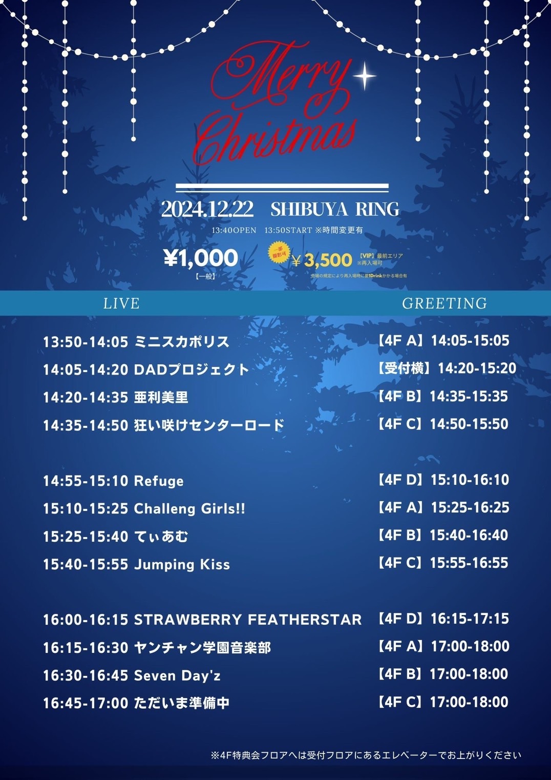 「THIS is OUR X'mas」 ■日時:2024年12月22日(日)13:40開場/13:50開演 ※時間変更有 ■会場:渋谷RING 🎤JumpingKiss 15:40~15:55 ⏰特典会 15:55~16:55【4F C】 ■出演: Jumping Kiss ミニスカポリス 狂い咲けセンターロード DADプロジェクト てぃあむ ヤンチャン学園音楽部 亜利美里 Refuge Seven Day'z Challenge Girls!! STRAWBERRY FEATHERSTAR ただいま準備中 ■チケット 1Drink別途 ①Sチケット(最前エリア) 3500円 ②一般チケット 1000円 [ライブ中の撮影に関しまして] 以下出演者に関してはSチケットの方は撮影可能となります [動画〇/静止画〇]Jumping Kiss [動画✕/静止画〇]ミニスカポリス/Challenge Girls!! ・動画撮影はスマホ限定となります。 ・三脚一脚使用不可。 ・脚立、踏み台不可。 ※ライブのご観覧の他、特典会に御参加頂けます ※出演者の変更・キャンセルに伴う主催者からの返金払い戻しはございません。 【チケット】 ▶︎観覧 https://t-dv.com/241222ring ※12/11 22:00-受付 ▶︎配信 配信は見送りとなりました、ご了承下さい ≪入場順≫ ①⇨② ※整理番号順 *お客様の体調不良を含めた御都合等によるチケットのキャンセル・払い戻し等はお受けできませんのでご了承下さい。 *当日体調がすぐれない場合はご参加をお見送り頂きます様お願い申し上げます。 -------- 以下サイトにて最新情報随時発表 https://www.monstarjapan.jp/#idolidge https://twitter.com/IDOLidge